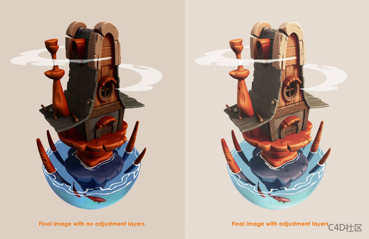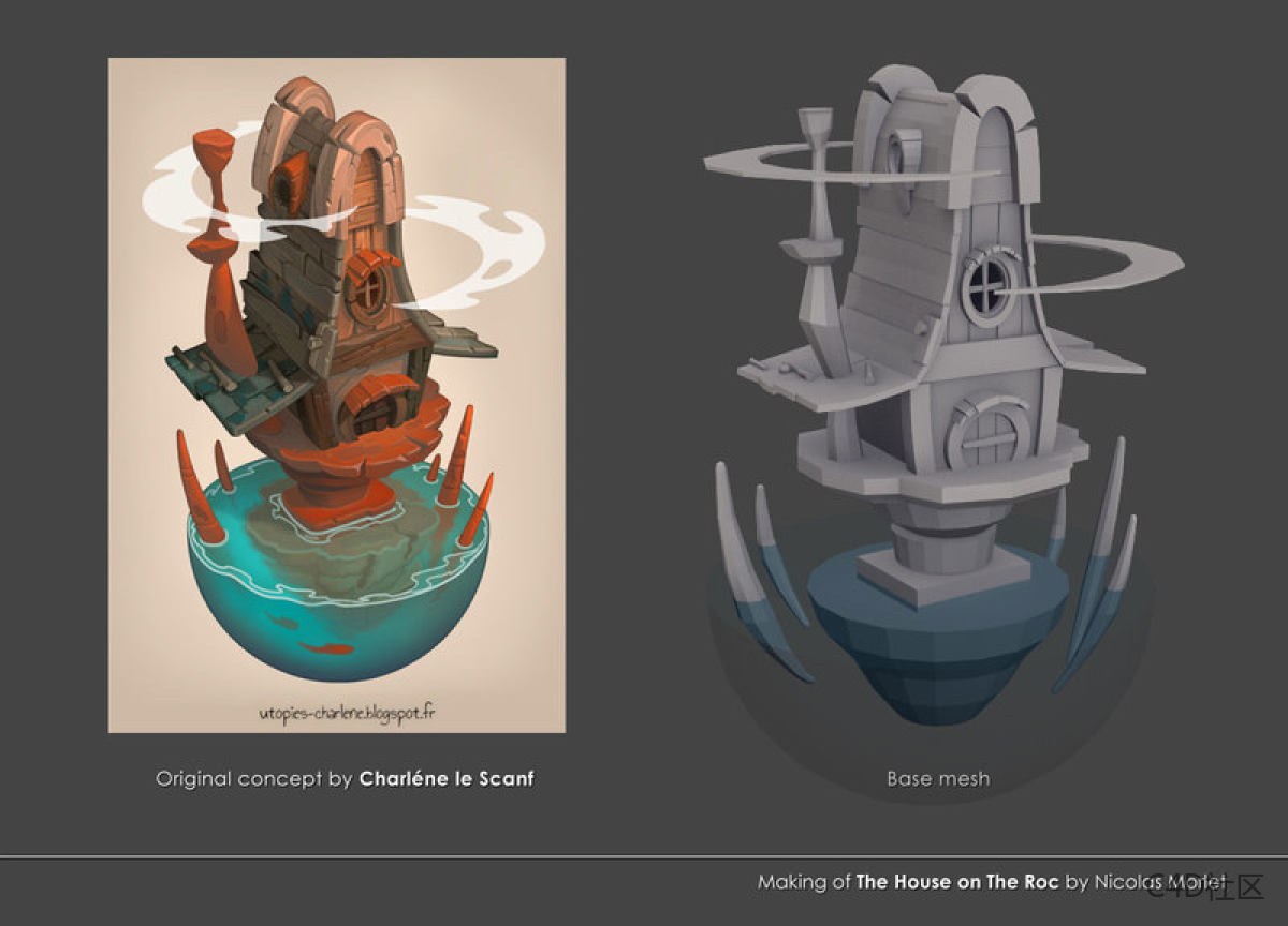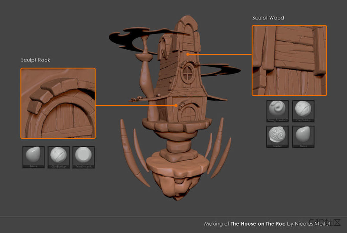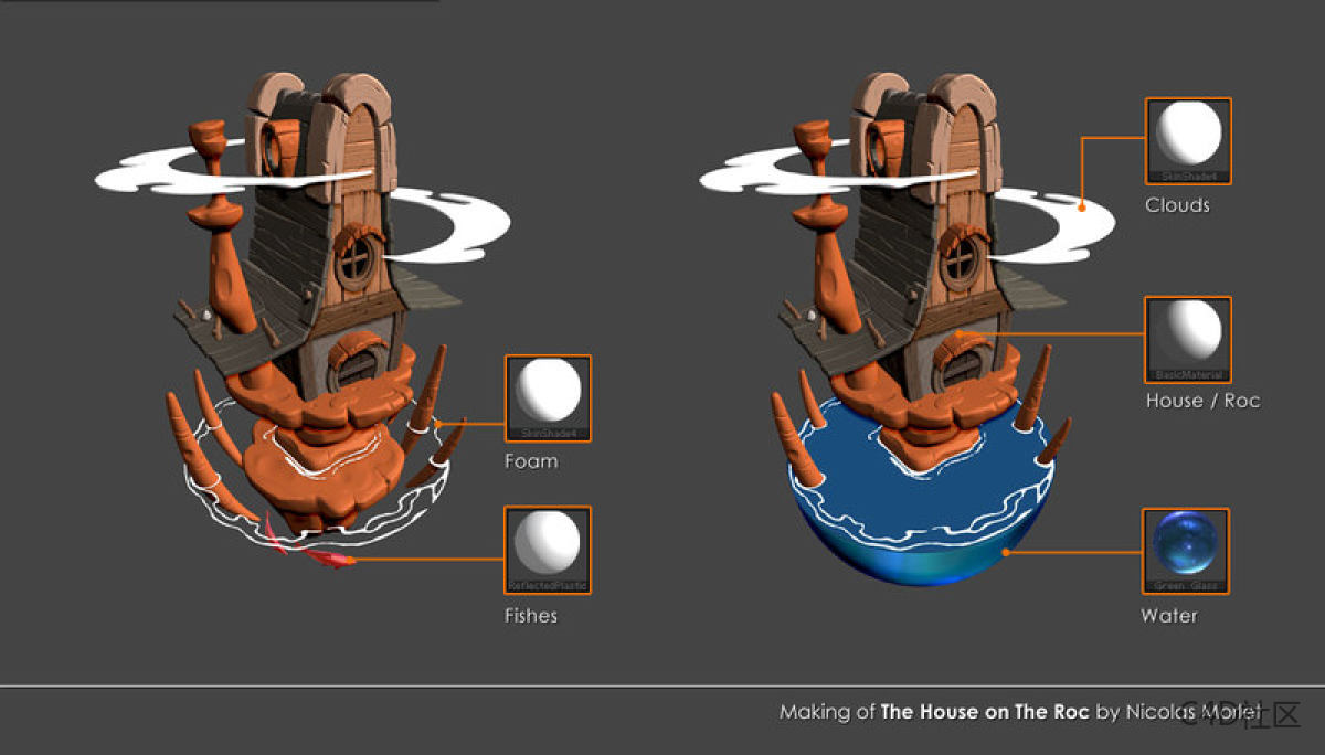 我不熟悉暴雪的图形3D风格,所以我做了一些研究,发现了Michael Vicente的惊人作品,像风筝英雄的“Orb” ,这是雕塑过程中的参考。在ZBrush中,每个元素都从上到下(云,房子,岩石和水)组织在不同的SubTool中,保持逻辑层次结构与图示的视觉阅读。