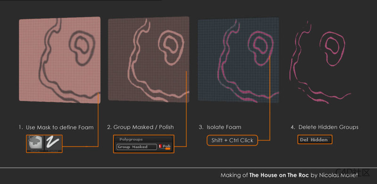 我把部分淹没的岩石看作是一个地标,然后我复制了水网,删除了基地,开始上盖。 用MaskPen绘制泡沫,在Polygroups中,我使用了波兰语的Group Masked设置为1.使用这些不同的Polygroup,我选择了创建的泡沫的内部部分,并通过删除隐藏的组将其隔离为一个网格。