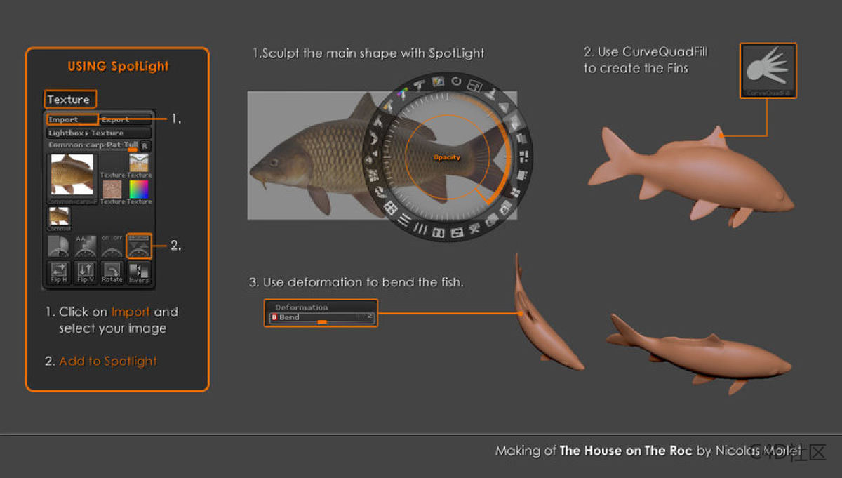我从Dynamesh Sphere开始使用SpotLight来雕刻鱼的主要形状。 第一次使用CurveQuadFill刷子的鳍,它是非常有效的。 一旦您准备好了模型,请转到“变形”,并在所选轴上注意使用“弯”。 一旦完成,你会得到一条干净的曲线的鱼。