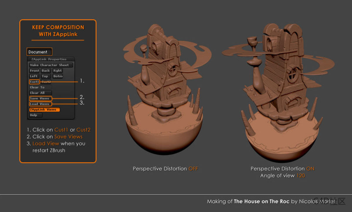 ZAppLink有助于存储视图,您可以在雕刻时轻松移动模型,然后单击相应的插槽(Cust1,Cust2)返回您的视图。 我重新调整和移动了一些元素,直到我对组合感到满意。