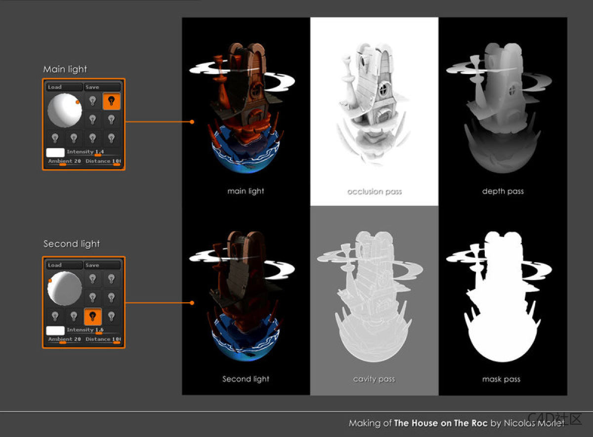 通过这个场景的照明非常简单。 两个灯,右侧的主灯和图像左下方的第二个光。Daniel Bystedt的教程“ZBrush 4 R2中的BPR渲染工作流程”是有启发性的,帮助我很多设置BPR通行证。