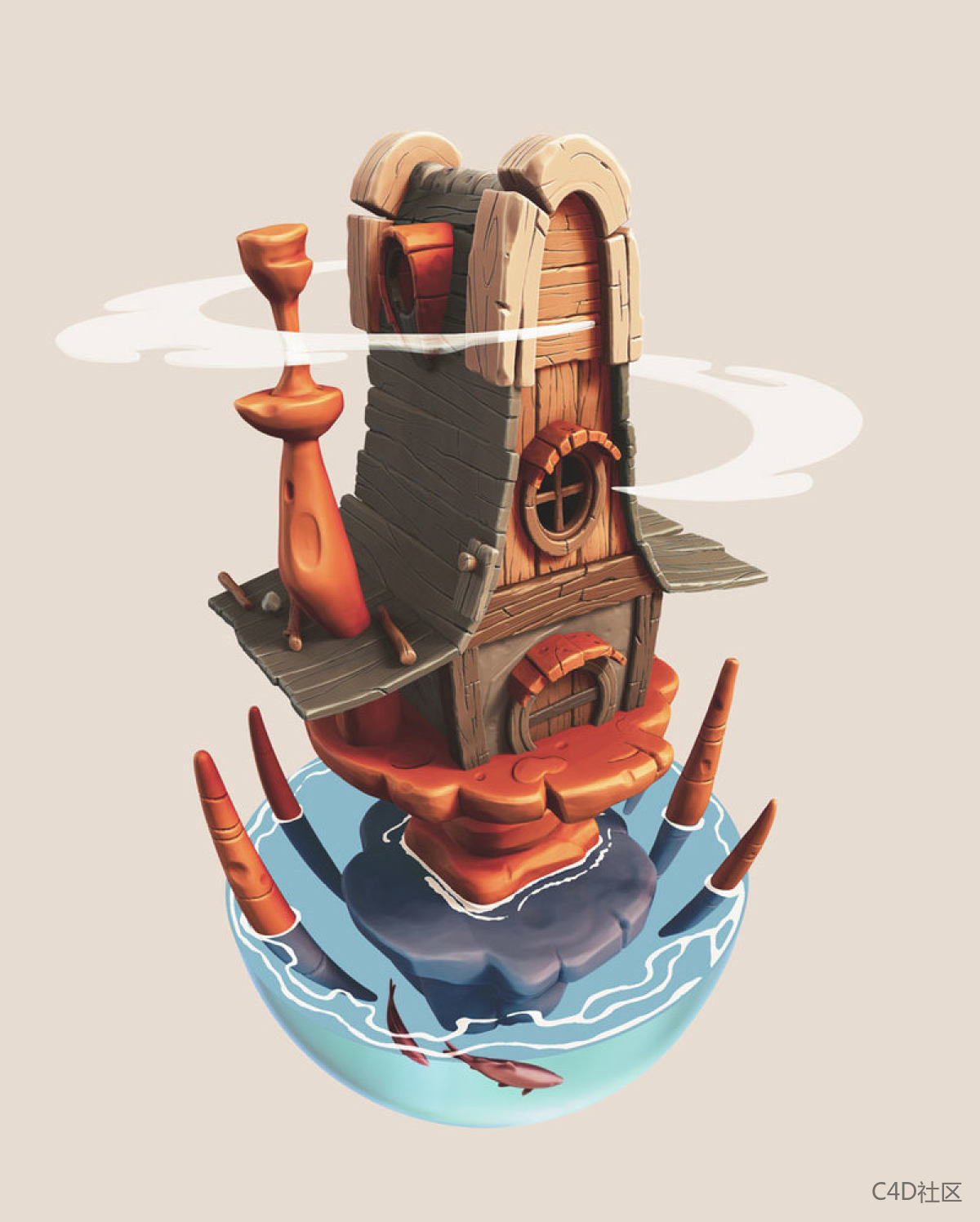 我在这个场景中用Polypaint直接在ZBrush中创建了纹理,一个是House和Rock的基本材料,用于云层和泡沫的Skinshade,用于鱼和GreenGlass(Matcap)的水的ReflectivPlastic。 您可以在Pixologic的下载中心找到GreenGlass Matcap。 要使用SubTool获得透明度,请选择它并转到显示属性/ BPR设置,然后激活BPR透明阴影,并根据需要设置BPR可见性。 不要忘记激活渲染>渲染属性>透明的透明度。 您还可以使用BPR透明度设置来优化效果。