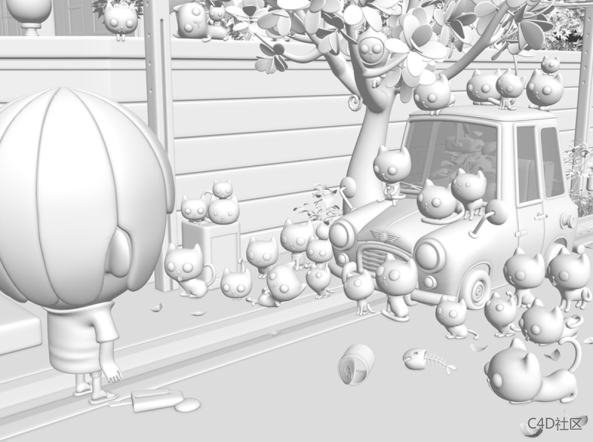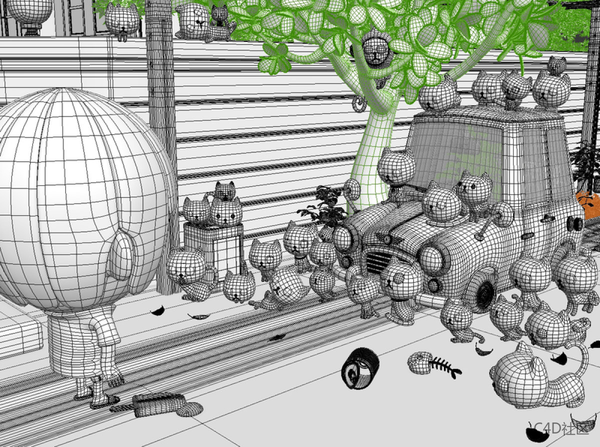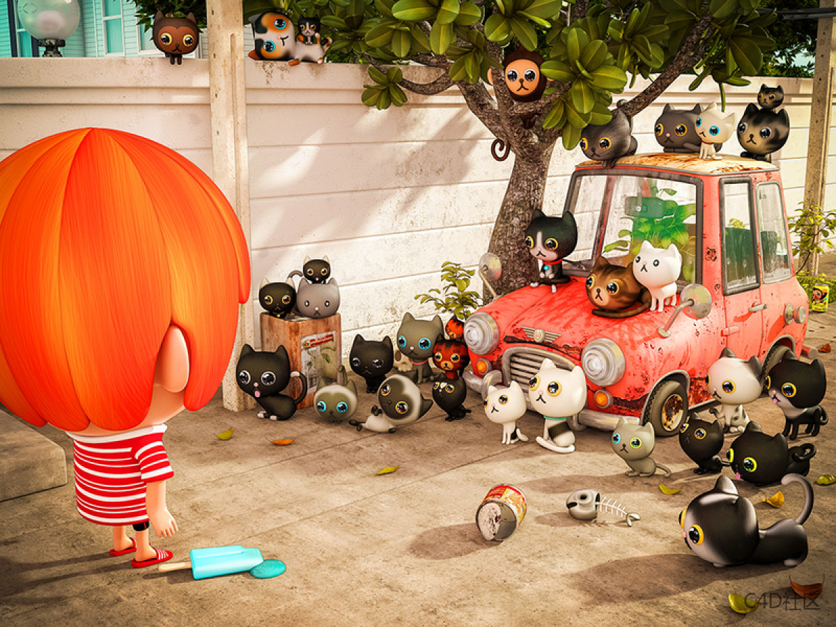 步骤03:构图场景是建立在我家附近的一个街区,是我生命中真实的故事。即使汽车残骸和猫群已经不存在,但在我的记忆中却是永恒的。这项工作需要耐心。对于树和背景,我使用基本的3ds Max工具来编辑多边形。 我把它们变成了SD(super-deformed是日本漫画的特定风格,其中人物以夸张的方式绘制,通常小而胖,具有粗短的四肢和超大头,使其类似小孩)风格,这对于这些模型来说并不困难。关于树上的小猴子,我总是在我的工作中显示他们,因为我出生在猴年。 猴子是我的象征性代表:顽皮,活跃,聪明,可爱。 此外,这意味着这项工作是基于我的现实生活。