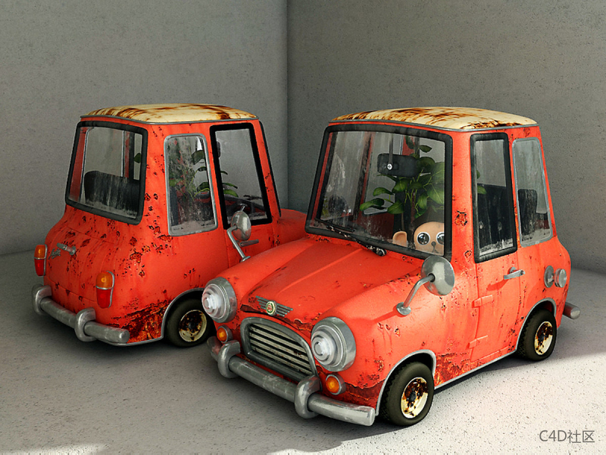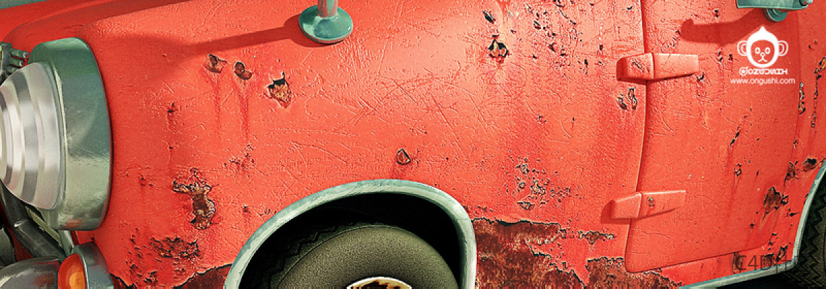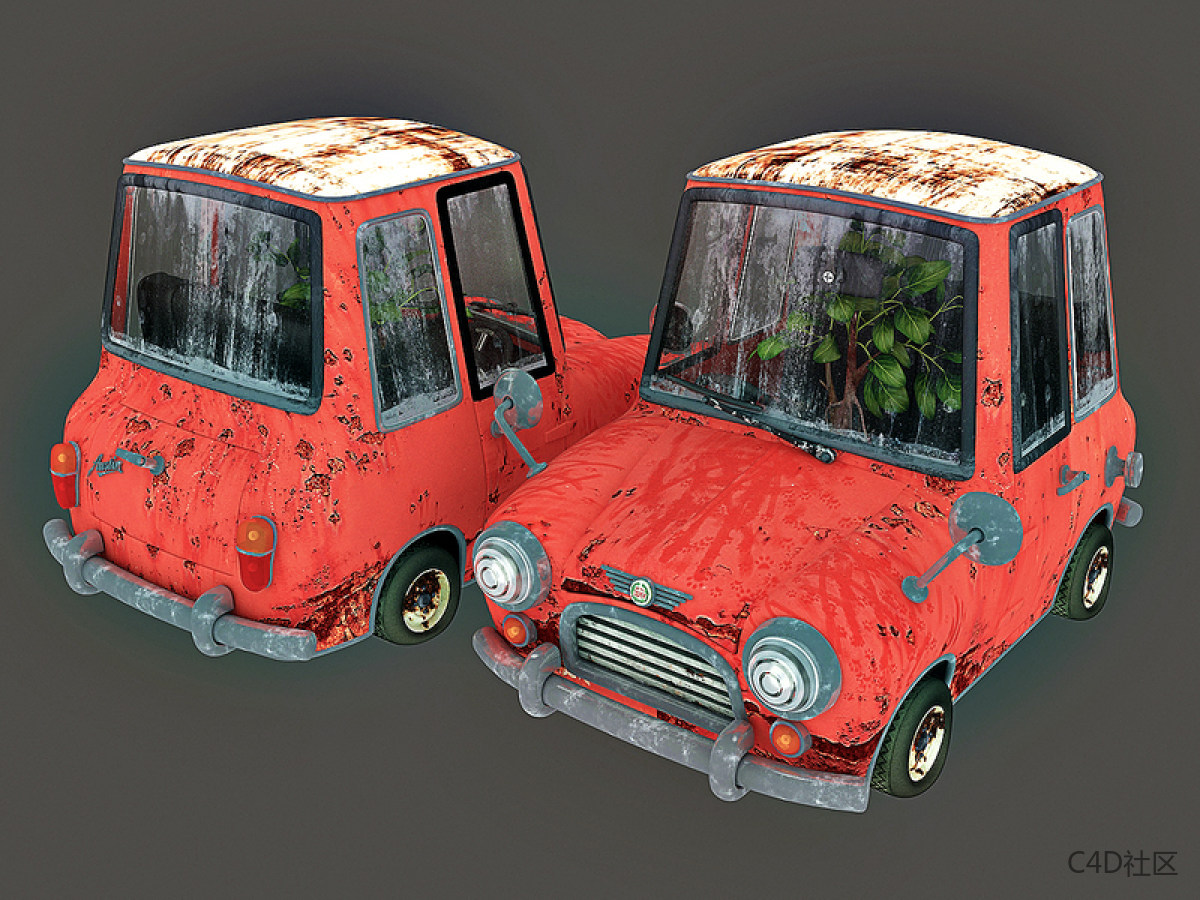 步骤05a:汽车模型接下来是汽车模型,它充满了细节:使它看起来像一个残骸,有雨痕,灰尘,锈迹和猫爪印。 对于纹理,我使用绘画工具把金属图片混合,然后将它们与生锈照片混合。