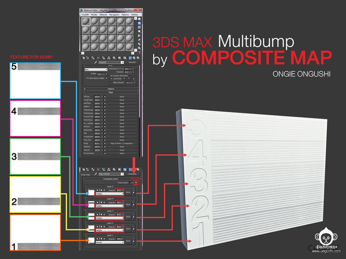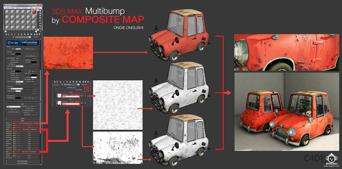 步骤05b:汽车模型为了使汽车看起来更有趣,更多的空间感,我使用“multibump”技术,用Composite Map对汽车施加生锈和划痕。我有五个图像来做出Bumps。我选择Bump作为Composite类型,根据所需的Bump文件添加五层。接下来,选择要进入Bumps的文件,并将它们放入每一层。我将层2-5的模式从“Normal”切换为“Multiply”,并调整不透明度以将它们与第一层混合。例如,我调整每层的不透明度为100/80/60/40/20,这显然有所不同。